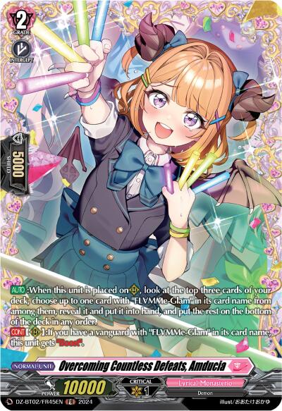[AUTO]:When this unit is placed on (RC), look at the top three cards of your deck, choose up to one card with "FLMMe-Glam" in its card name from among them, reveal it and put it into hand, and put the rest on the bottom of the deck in any order.