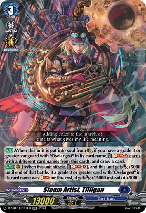 [AUTO]:When this unit is put into soul from (RC), if you have a grade 3 or greater vanguard with "Oselargest" in its card name, [COST][Soul-Blast 2 cards with a different card names from this card], and draw a card.