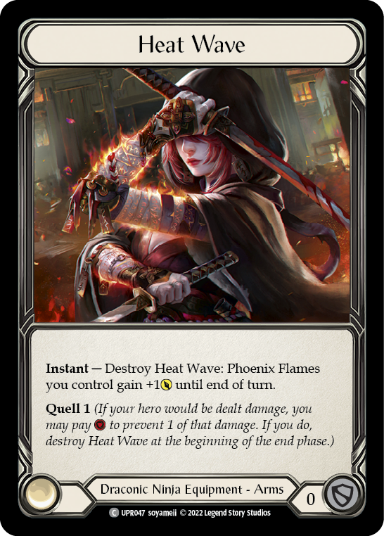 Quell 1 (If your hero would be dealt damage, you may pay {r} to prevent 1 of that damage. If you do, destroy Heat Wave at the beginning of the end phase.)