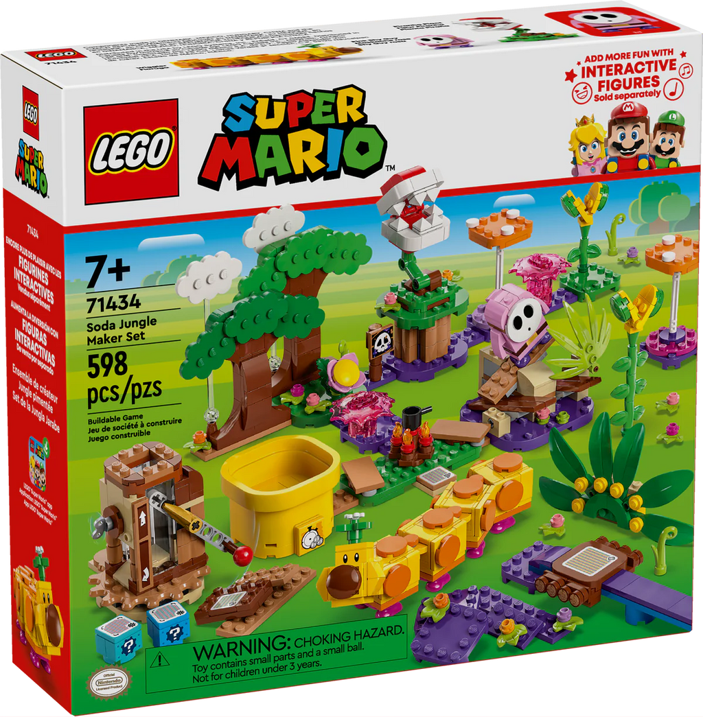 Give kids everything they need to create and customize their own buildable adventures with the LEGO® Super Mario™ Soda Jungle Maker Set (71434). This Nintendo® character toy playset, which makes a cool gift for boys, girls and any gamers aged 7 and up, features 3 LEGO Super Mario toy figures – a Pink Shy Guy, Wiggler and Piranha Plant. There’s also a Customization Machine to select the rewards offered by the 2 ? Blocks, a Special Pipe: Speed Run for speed challenges, a raft, campfire and lots of jungle scenery. Add a LEGO® Mario™, LEGO® Luigi™ or LEGO® Peach™ figure (from sets 71439, 71440 or 71441 – sold separately) to this toy playset for interactive play. Earn digital coins for riding the Wiggler, toppling the Pink Shy Guy, crossing the poison swamp on the raft, and more. This customizable toy for kids is great for solo play or as a social activity. Find building instructions in the box or on the LEGO Super Mario app, which also offers imaginative ideas for ways to build and play.