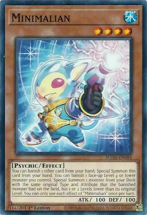 You can banish 1 other card from your hand; Special Summon this card from your hand. You can banish 1 face-up Level 4 or lower monster you control; Special Summon 1 monster from your Deck with the same original Type and Attribute that the banished monster had on the field, but 1 or 2 Levels lower than its original Level. You can only use each effect of "Minimalian" once per turn.