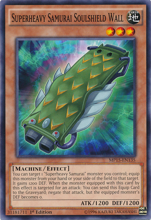 You can target 1 "Superheavy Samurai" monster you control; equip this monster from your hand or your side of the field to that target. It gains 1200 DEF. When the monster equipped with this card by this effect is targeted for an attack: You can send this Equip Card to the Graveyard; negate that attack, but the equipped monster's DEF becomes 0.